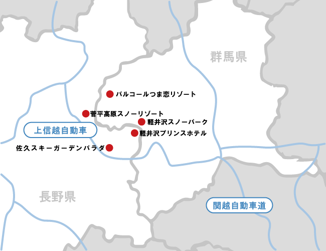 車、電車共に首都圏からのアクセスが良く、日帰りでもたっぷり楽しめるスキー場が多いエリアです。特に軽井沢プリンスホテルスキー場はJR新幹線・軽井沢駅より徒歩圏内、車でも東京から3時間程度で到着する日帰りスキー・スノボに人気のスキー場となっています。