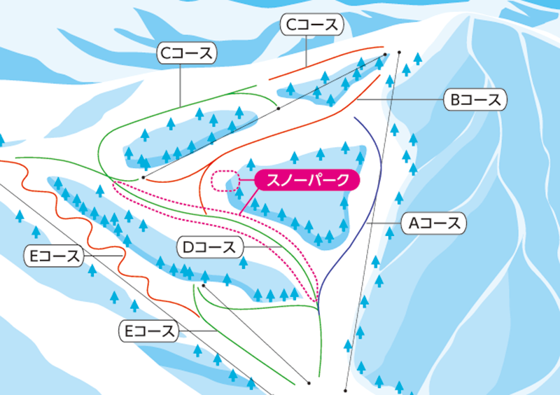 ゲレンデはコンパクトながら、緩斜面から急斜面まで変化に富んでおり充分に楽しむことのできます。さらに、金・土曜日のナイターは24時間営業しているのもうれしいポイント。初心者向けコースの「Dコース」は全長1,080mの緩斜面ロングコースでビギナーやファミリーも安心して滑走することができます。また、コースの途中にはパークアイテムが設置されています。ステップアップしたい方には「Cコース」がおすすめ。最大21度の急斜面をクリアすると斜面が緩やかになりDコースへ合流します。アクセス良し、コース良しの日帰りに最適なスキー場です。