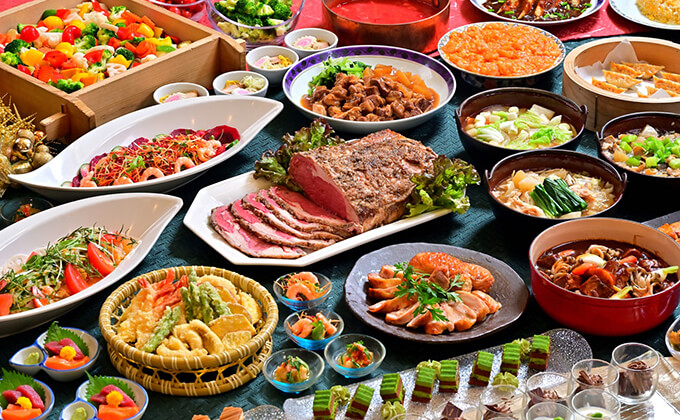 食事はバイキングだったが、野菜たっぷりの郷土料理や天ぷら、海鮮焼きもあり、とても満足。 -