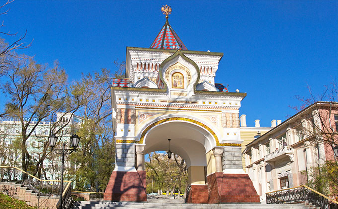 グム百貨店から徒歩5分ほどにある、鮮やかな色の凱旋門です。帝政ロシア時代の1981年にニコライ二世が日本に立ち寄った帰りに、記念に建てられました。