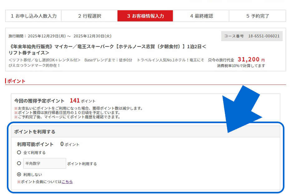 入力内容を確認し、そのまま予約完了まで進むと、旅行代金にポイントが反映されます。