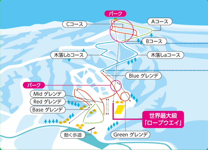 白銀世界のパウダーコースやフラット&幅広コースからなるスキー場。コースレベルが多彩なので初級者~上級者まで楽しめます。絶景「SORA terrace」までは世界最大級ロープウェイで約10分の空中散歩も楽しめます。