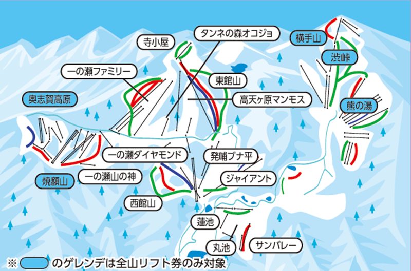 志賀・北志賀エリアの人気スキー場をご紹介!コース数やリフト本数、ゲレンデマップを一覧で掲載しています。初心者、ファミリー、カップル向けなどトラベルインおすすめのスキー場は要チェックです!