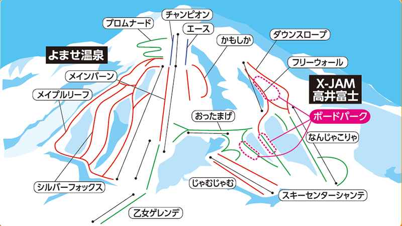 年々進化している高井富士エリアのスノーボードパークは上級者も唸るビッグパーク!スキーヤーのメッカであるよませは、山頂からの景色も抜群!異なる2つのスキー場を楽しめる贅沢なプラン!