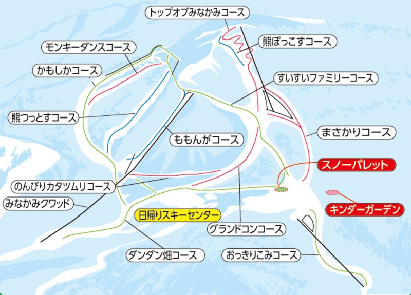 なお森の中を通ってホテルに戻る「まさかりコース」、第2リフトへの連絡となる「グランドコンコース」「のんびりカタツムリコース」も中級者向けとされています。