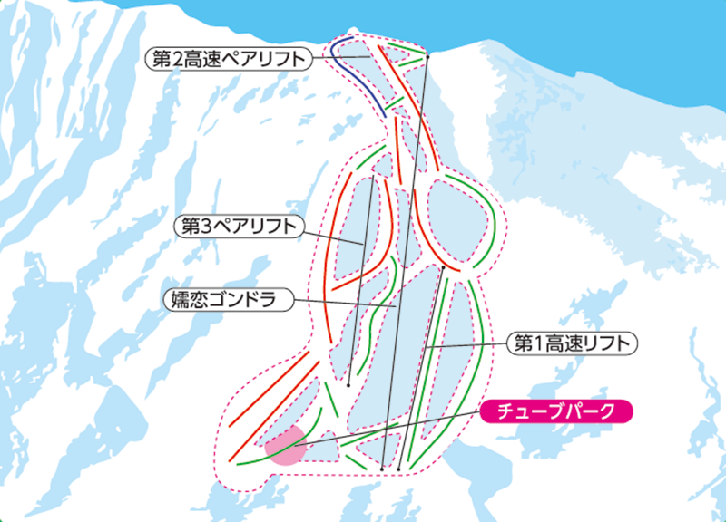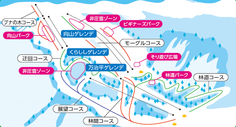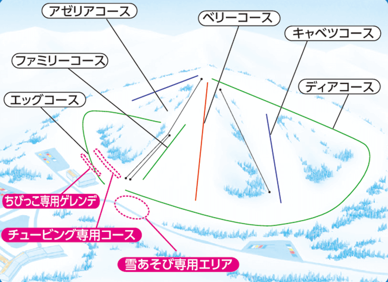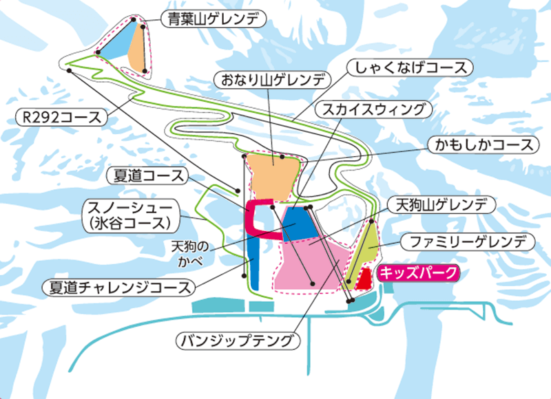 首都圏近郊にありながら、山頂では標高1,550mのパウダースノーが楽しめる。緩斜面が多く、初心者・ファミリー層からの支持も高い。