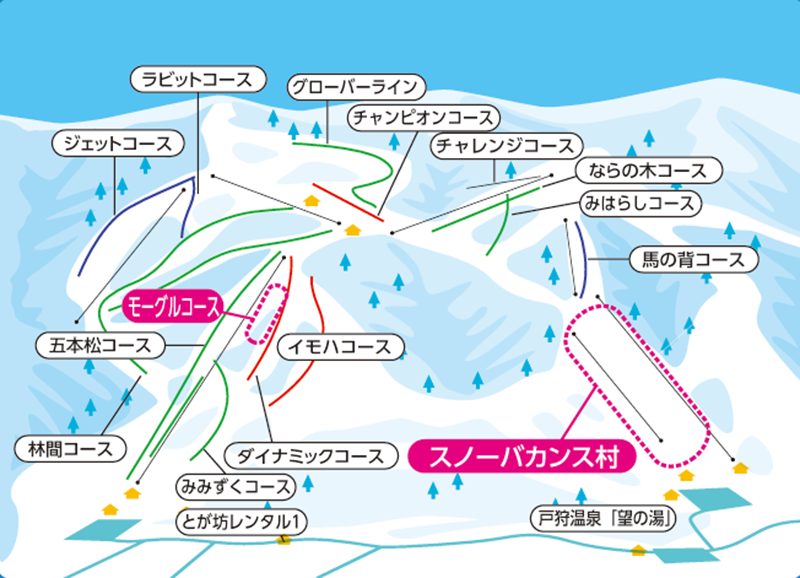 比較的人が少なく、広いコースも多いためゆったり滑れる穴場ゲレンデとして人気があります。千曲川の流れを一望できる「ペガサスエリア」と、標高が高く良い雪質を楽しめる「とん平エリア」の2エリアで構成されています。幅広で緩やかなロングコースが楽しめる初心者でも安心な「林間コース」、雪質の良い中斜面を滑る「チャンピオンコース」、眺め抜群の非圧雪の「ダイナミックコース」などがおすすめです。スキー場名に「温泉」が付くように、ゲレンデ目の前に2か所の立ち寄り温泉があり、アフタースキーにも便利なスキー場です。