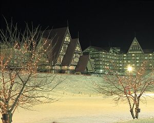 ホテル前はイルミネーションとともに灯るナイターの光がなんだか幻想的です。