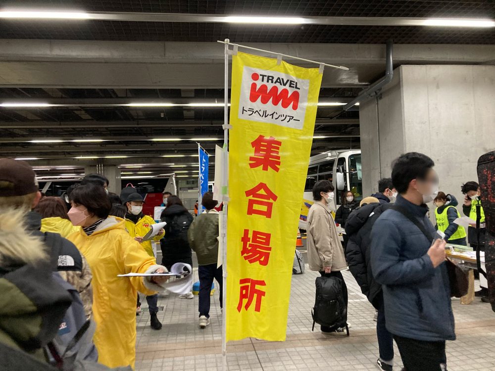 集合場所である新宿大型バス駐車場は、他のバスツアー客も利用する集合バス乗り場のため、たくさんの人がいました。トラベルインのスタッフは、黄色ののぼりを立てて受付をしています。人が多い中でも、黄色のスタッフ用コートを着たトラベルインのスタッフは見つけやすかったです。行き先別に受付が分かれ、チケットの受け取りや自分たちが乗りこむバスの案内などがあります。