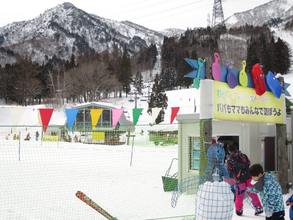 「わくわくスノーランド」は苗場スキー場の南側にある、ファミリー向けの広場です。スキーやスノボができなくても、雪で楽しく遊べるように様々な遊具が設置されています。スノーエスカレーターで坂を上ってスノーチュービングやソリで滑り降りたり、雪遊びをしたり、小さな子どもでも雪を満喫できる広場です。