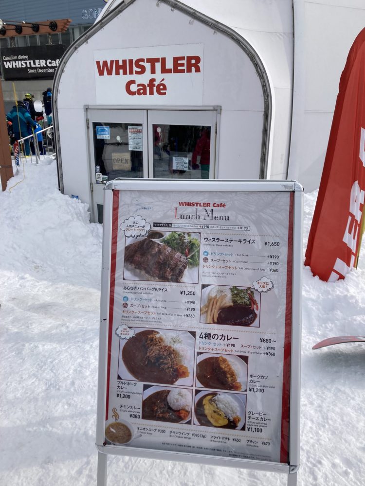 今回のゲレ食は「WHISTLER Café(ウィスラーカフェ)」です。第2ゴンドラの乗り場近く、「苗場プリンスホテル」の2号館前にある、特徴的なドーム型の建物のカフェです。店内では、カナダにある有名なスノーリゾート、ウィスラーを紹介する動画が流れ、カナダの国旗がかかげられています。スポーツパプのような雰囲気です。入口の階段が滑りやすくなっているので注意してください。