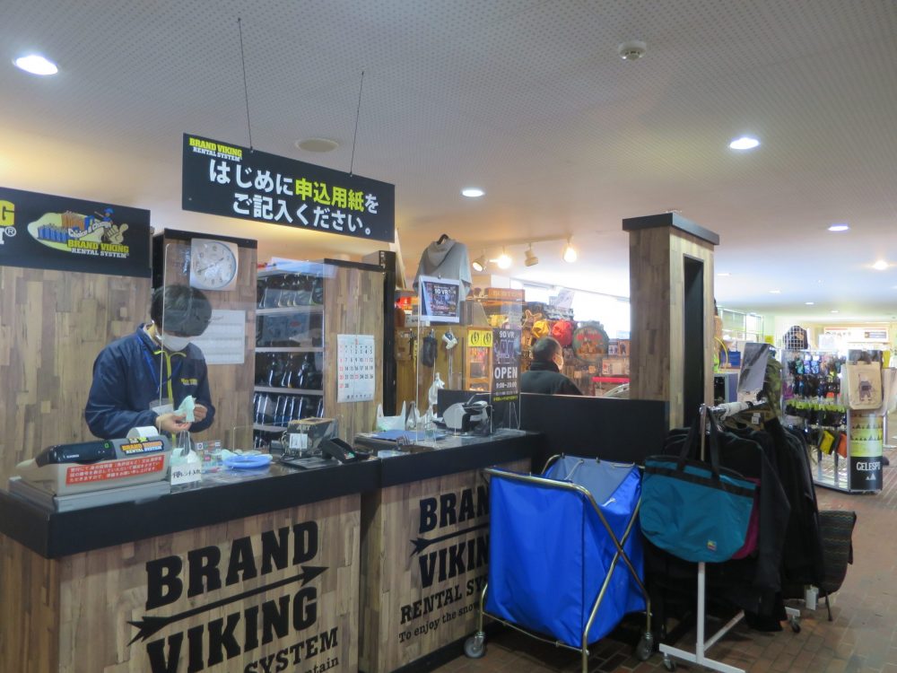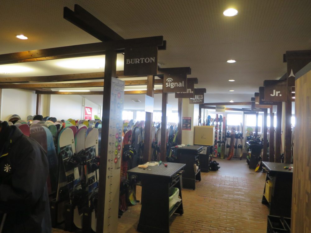 こちらはトラベルインのツアー指定のショップではないですが、日帰りスキーセンター内にもレンタルスペースがあります。申し込むと1日に何度もメーカーを変更して好きなウェアやスキー、ボードを借りることができます。つまり、スキーを午前中に借りて、午後からボードに替えることもできるシステム。スキーとボード、どちらにしようか迷っている人にピッタリです。