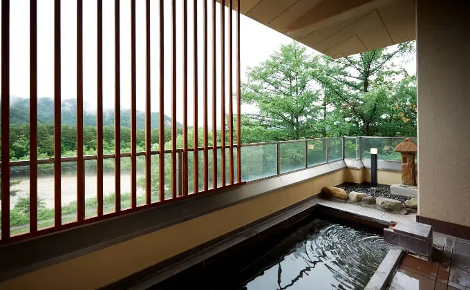 「緑翠亭景水」の建物は、湯楽の館「翠」、蔵の館「紫」、薫風の館「茜」に分かれており、それぞれ違う雰囲気を味わうことができます。湯楽の館「翠」にある露天風呂付きのお部屋では、湯を独り占めできるのでウッドテラスから鹿島川の清流を眺めながら、誰にも邪魔されずのんびり過ごしたい方におすすめです。蔵の館「紫」は、古民家や蔵の梁を使った昔ながらの情緒あるお部屋です。薫風の館「茜」は、贅沢な間取りの洋室や特別室が用意されています。